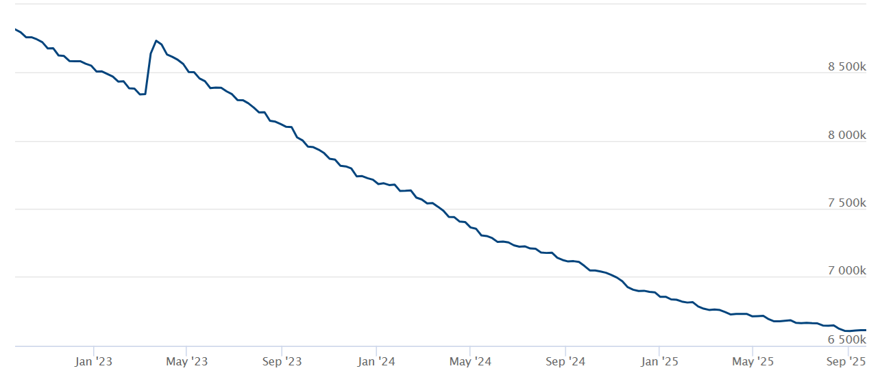 The S&P 500 has shown remarkable resilience amid this uncertainty, as traders anticipate further interest rate cuts from the US Federal Reserve (Fed) and additional liquidity injections. Total assets on the Fed’s balance sheet stabilized in September after 30 consecutive months of decline, signaling a potential reversal that could support risk-on markets.