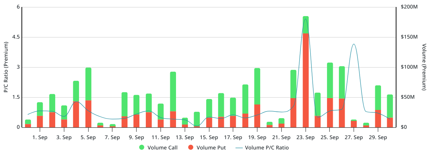Premiums paid for put (sell) options have lagged behind call (buy) instruments on Deribit, indicating that neutral-to-bullish strategies have been more in demand. The sudden spike on Saturday is not representative, as the total premium paid that day was less than $13 million. Overall, the data show no signs of stress or a surge in demand for bearish positions.