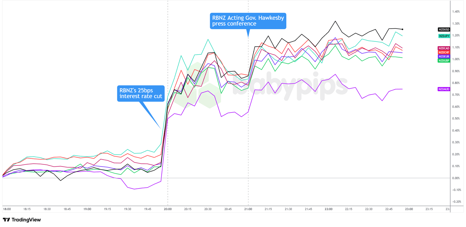 The Reserve Bank of New Zealand (RBNZ) cut its Official Cash Rate by 25 basis points to 2.25% on Wednesday, matching market expectations but delivering a surprisingly hawkish message that sent the New Zealand dollar surging across the board.