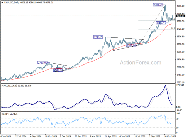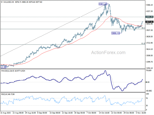 Technically, Gold has broken decisively above its 55 4H EMA, indicating that the pullback from 4,381.22 likely completed at 3,886.41, ahead of 55 D EMA. Decisive break above 4,161.35 resistance would confirm upside momentum toward 4,381.22. However, strong resistance is expected near that level, to bring another fall to extend the consolidation, before the longer-term uptrend resumes.