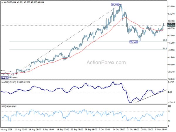 Silver’s structure shows a similar setup. Its decline from 54.44 seems to have ended at 45.20, ahead of 55 D EMA. Sustained trade above 49.42 resistance would target a retest of 54.44. As with Gold, resistance there should limit gains and set the stage for another short-term retreat—potentially toward 45.52—before the broader bullish trend resumes later.