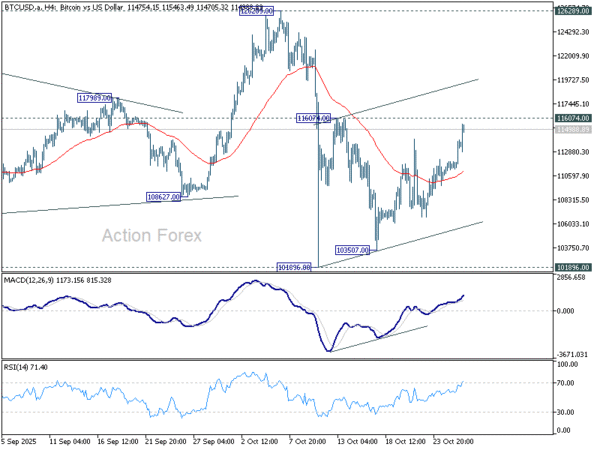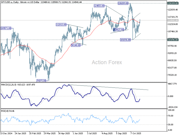 Technically, immediate focus is now on 116,074 resistance. Firm break above that level would confirm that the entire pullback from 126,289 represents only a consolidation to the five-wave rally from 74,373, rather than a larger scale correction. In that case, another rally toward 126,289 would be favored, though that prior high could still act as a cap within the range. Even if the consolidation extends with another downleg, the downside should remain contained above 101,896.