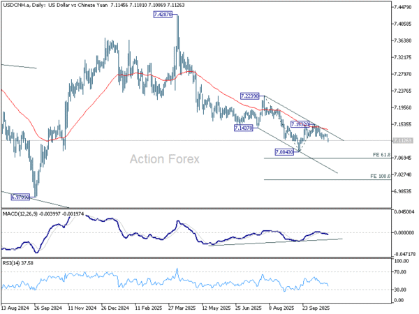 Technically, USD/CNH’s gap-down move today confirmed renewed downside momentum. The rejection by 55 D EMA (now at 7.1532) indicates the corrective bounce from 7.0843 has ended, with sellers regaining control. Break below 7.0843 would resume the broader downtrend from the April high of 7.4287 toward 61.8% projection of 7.2239 to 7.0843 from 7.1532 at 7.0669 next.