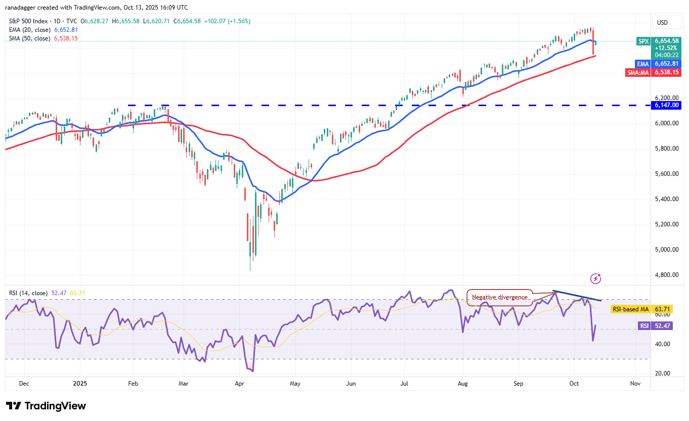 The bulls purchased the dip to the 50-day simple moving average (SMA) (6,538) and have pushed the price to the 20-day exponential moving average (EMA). If the price turns down sharply from the 20-day EMA, the bears will again try to sink the index below the 50-day SMA. If they succeed, the correction could deepen to 6,350 and then to 6,200.