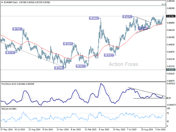 EUR/GBP’s break of 0.8750 resistance confirms resumption of whole rally from 0.8221. Intraday bias is back on the upside for 0.8867 fibonacci level. On the downside, below 0.8718 minor support will turn intraday bias neutral again first. But near term outlook will now stay bullish as long as 0.8654 support holds, in case of retreat.