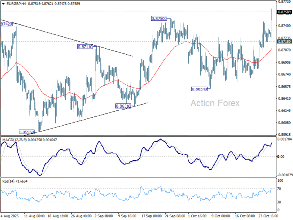 In Europe, at the time of writing, FTSE is up 0.20%. DAX is down -0.04%. CAC is down -0.07%. UK 10-year yield is down -0.011 at 4.394. Germany 10-year yield is flat at 2.620. Earlier in Asia, Nikkei fell -0.58%. Hong Kong HSI fell -0.33%. China Shanghai SSE fell -0.22%. Singapore Strait Times rose 0.23%. Japan 10-year JGB yield fell -0.035 to 1.640.