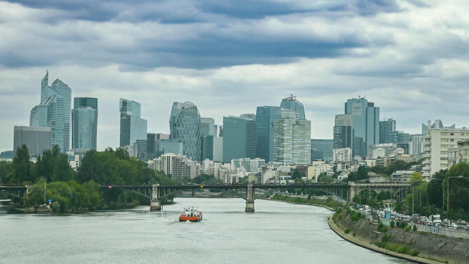 View of the La Defense business district from the banks of the Seine, with in the center the Coeur Defense tower and the Alto tower.