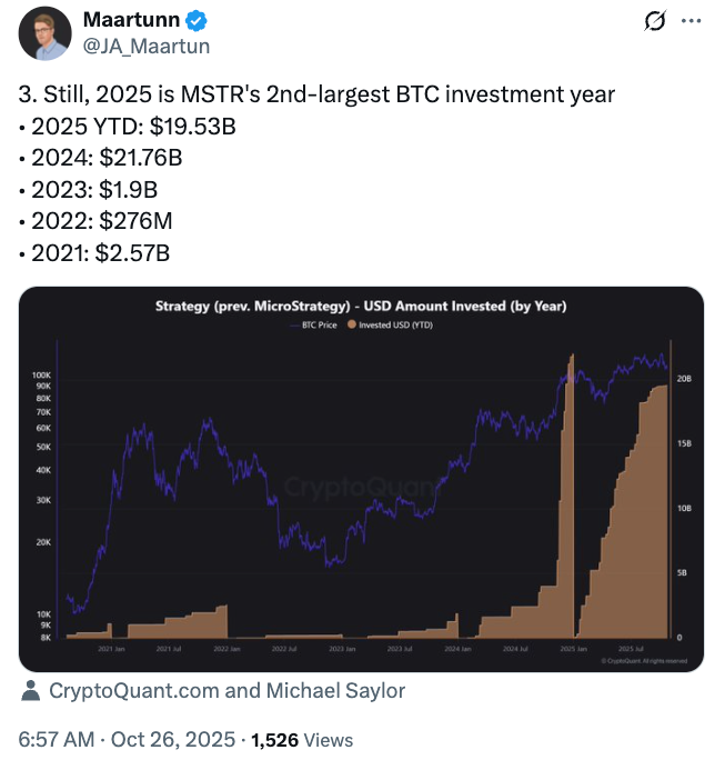 Despite the sharp slowdown, 2025 remains the biggest year for Bitcoin investments by Strategy, with $19.53 billion spent on BTC acquisitions so far. The company still has roughly two months to surpass last year’s record of $21.76 billion spent on BTC, according to Maartun.