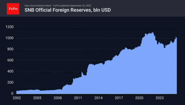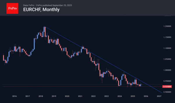 The dynamics of changes in foreign exchange reserves show that the SNB has been selling francs and buying foreign currency since the end of 2023. All this time, EURCHF has not fallen below 0.9200. At the same time, since 2021, the pair has been forming a sequence of lower local highs, indicating growing pressure from franc buyers. This resistance line is now near 0.95, compared to 0.9650 at the beginning of the year, 0.9950 in May 2024, and 1.11 at the beginning of 2021.