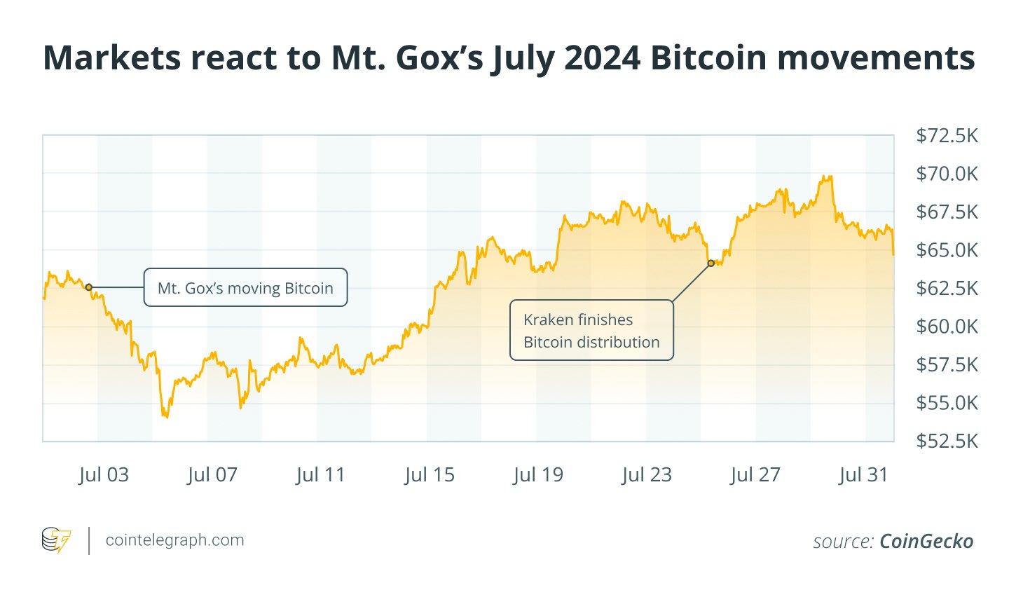 In early July, Mt. Gox wallets began moving Bitcoin as the exchange prepared for creditor repayments under the civil rehabilitation plan. Markets initially feared that recipients would immediately sell. Bitcoin dipped again after Kraken, one of the exchanges handling distributions, announced on July 24 that it had completed its process.