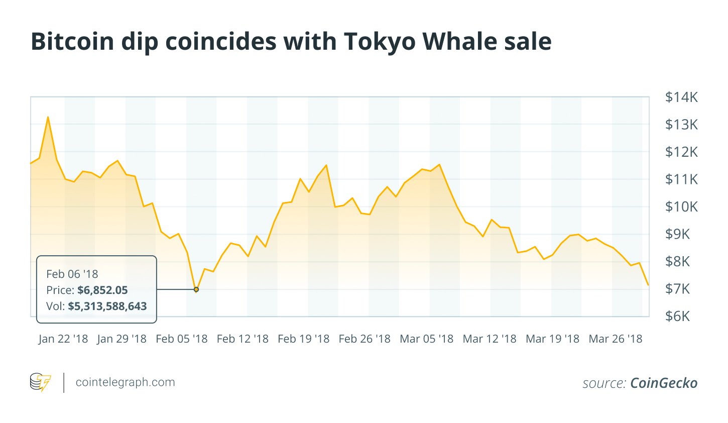 While Bitcoin was already struggling after the collapse of the ICO bubble, its sharp drop on Feb. 6 closely coincided with Kobayashi’s major sell-off. Kobayashi denied that his Mt. Gox liquidations deepened the decline, but his actions drew criticism from market observers.