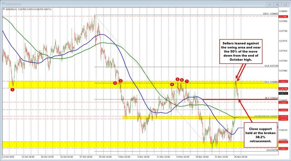 The RBNZ cut the Official Cash Rate by 25 bps to 2.25%, with the decision supported by a 5–1 committee vote. Policymakers noted that while annual consumer inflation increased to 3% in the September quarter, significant spare capacity in the economy should help bring inflation back toward 2% by mid-2026. Economic activity, which was weak in mid-2025, is beginning to recover, aided by lower interest rates that are supporting household spending and a stabilizing labor market. The Bank emphasized that future OCR moves will depend on how medium-term inflation and economic conditions evolve, with further reductions seen as helping to underpin confidence and offset the risk of a slower-than-desired recovery. The committee weighed holding the OCR at 2.50% versus cutting but ultimately opted for the reduction given the extent of excess capacity. The updated projections show the OCR at 2.25% in March 2026 (previously 2.55%) and 2.28% in December 2026 (previously 2.62%), highlighting the move lower today. Despite the cut, the prospect of the last rate cut has sent the NZDUSD higher. It is currently the biggest mover with a gain of 0.87% vs the USD. However, the pair did find willing sellers near the 50% of the move down from the end of October high, and swing area between 0.56796 and 0.56912 (high reached 0.5696).
