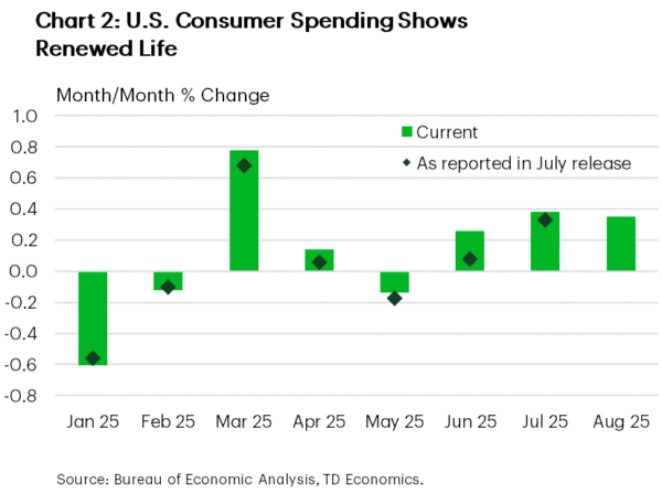 Encouragingly, the new-found momentum looks to have carried into Q3. Personal spending for August advanced 0.35% m/m (Chart 2), while income growth also remained healthy. Elsewhere, durable goods orders – a leading indicator of CAPEX – also came in on the hotter side. After incorporating this week’s data, our Q3 GDP tracking is now north of 3%.