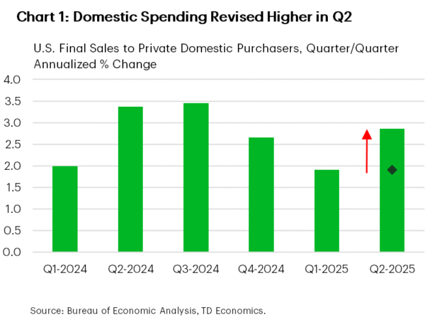 Turning to the economic data, the third revision to Q2 GDP showed a notable upgrade to growth (3.8% from 3.3%). Nearly all the additional strength came from consumer spending on services (2.6% from 1.2%) and business investment (7.3% from 5.7%). As a result, final sales to private domestic purchasers – our best gauge of underlying demand – was revised to 2.9% (from 1.9%), suggesting a more resilient economy (Chart 1).