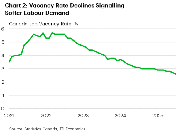 The cooling labour market is part of that story. July’s payroll report showed job vacancies slipping to 2.6% of total labour demand – the lowest since early 2017 (Chart 2). This signals a weaker hiring appetite, underlying our expectation for unemployment to rise to 7.3% by year-end.