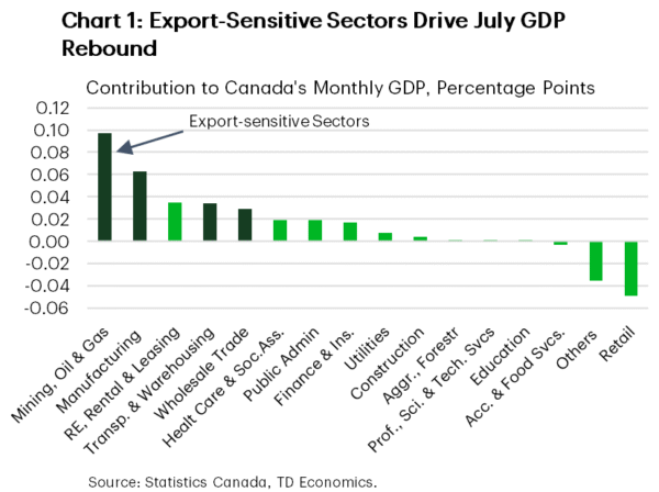 - Canada is likely to avoid a technical recession, with July GDP showing a rebound from the second quarter’s contraction and Q3 growth tracking in line with our forecast.