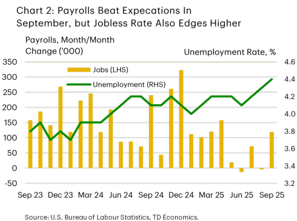 The delayed September payrolls report did little to reconcile the divide among policymakers. Hawks were likely reassured by the better-than-expected job gains: payrolls rose by 119k—the strongest reading since April (Chart 2). However, policy doves are likely to point to the negative revisions to prior months, the narrow concentration of job gains, and the uptick in the unemployment rate.