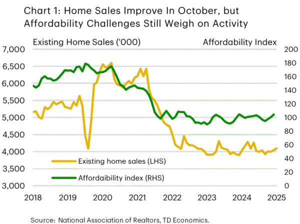 Official economic data began to trickle in, with September’s payroll report being the most notable. However, reporting backlogs are expected to persist. October payrolls will be released with November’s figures on December 16, not in time for the FOMC’s next meeting on December 9–10. Other data points, like October CPI, will not be released. On the housing side, existing home sales edged higher in October, supported by falling mortgage rates. Still, the housing market continues to tread water as affordability remains stretched, despite some modest improvement in recent months (Chart 1).