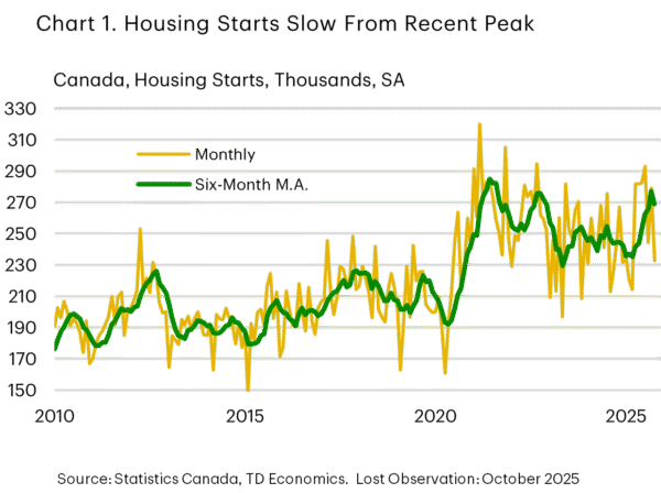 This sets the stage for next week’s third quarter GDP report. Our expectation is that growth will register somewhere between 0.5% and 1.0% on a quarterly (annualized) basis. This forecast, however, has an additional layer of uncertainty embedded in it as the U.S. government shut down delayed the release of Canadian trade data. Given the swings in trade in the second quarter, this forms a vital input into the projection – so its absence is adding uncertainty. We await clarity on when the information will be released and whether Statistics Canada’s estimates of third quarter GDP will incorporate the information or rely on their own estimates of the figure.