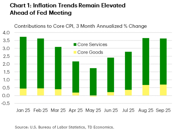 While the Department of Labor remains unfunded, the CPI data for September was released on Friday owing to its use in the annual inflation adjustment to social security payments. The data showed that recent inflationary pressures moderated slightly in September but remained elevated on aggregate, with the three-month annualized percentage change in core CPI running above 3.5% (Chart 1). With price growth still well above the Fed’s 2% target and the timing of future data releases uncertain, policy decisions are expected to be cautious moving forward.