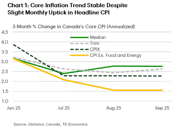 More difficult to ignore is the September inflation report, which showed headline CPI rising 2.4% year-on-year, above expectations for 2.2%. The acceleration was due to base effects, slower declines in gasoline prices, higher food prices, and a pickup in travel services prices. Still, inflation remains within the Bank’s 1-3% target range, while three-month trends in most core measures moved sideways (Chart 1). The breadth of inflationary pressure also held steady and should ease some of the Bank’s lingering concerns.