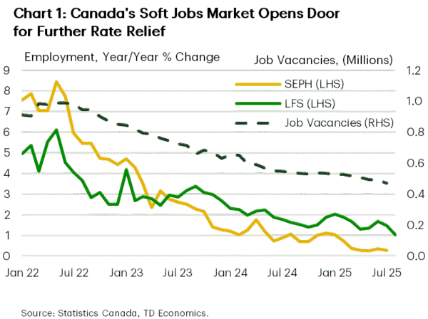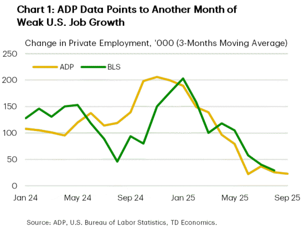Policymakers are certainly aware of the downside risks to Canada’s economic growth. Minutes from the Bank of Canada’s deliberations ahead of their September rate cut were released this week. And, they were dotted with dovish statements, including the observation that upward momentum in core inflation had diminished, the labour market had softened, and most counter-tariffs on U.S. products had been removed (reducing Canadian inflation risk). As of now, markets see a 60% chance of a follow-up rate cut by the BoC this month. However, we think the BoC will pull the trigger given the weak economic backdrop.
