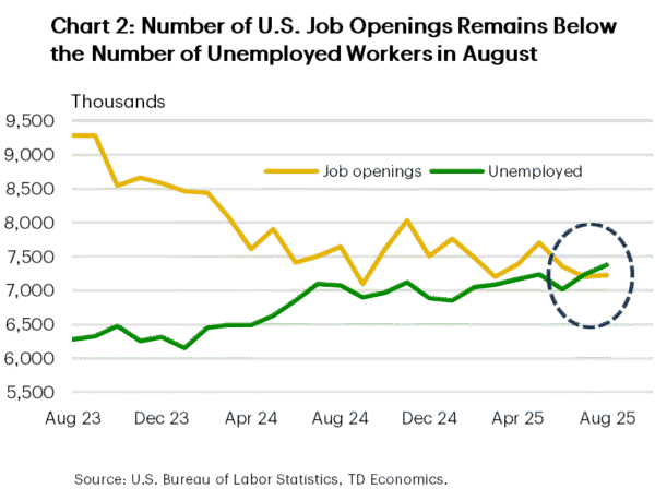 Without official payrolls data, employment surveys—such as ADP and JOLTS—filled the gap. The ADP report showed continued weakness in job growth in September, with private payrolls declining by 32,000. Though ADP data can be volatile, recent trends show greater alignment with payroll figures through 2025, especially on a three-month moving average (Chart 1). The August JOLTS report, released before the shutdown, also showed a hiring drought, with job openings below the number of unemployed for a second consecutive month (Chart 2). Although job opportunities were scarce, layoffs have remained subdued. Employers seem to be in “low hire, low fire” mode, supporting stability in the unemployment rate and helping to cushion consumer spending for now.