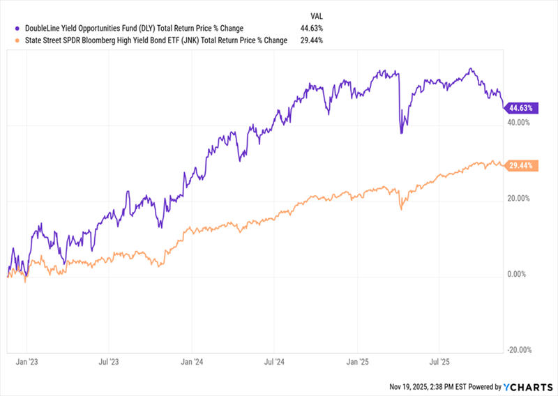 One thing you do not want to do at a time like this is pick up a corporate bond ETF like the SPDR Bloomberg High-Yield Bond ETF (JNK), which pays 6.5% today. That’s not bad, but pales in comparison to the payout of a corporate-bond CEF like the 9.7%-yielding DoubleLine Yield Opportunities Fund (DLY).