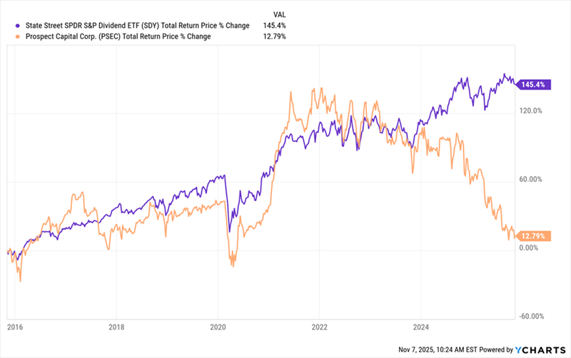Consider an ETF like the State Street SPDR S&P Dividend ETF (SDY), whose 2.6% yield is small but still more than double that of the S&P 500. That’s some consolation for yield-hungry investors–especially since SDY has had a much better return than PSEC in the last decade.