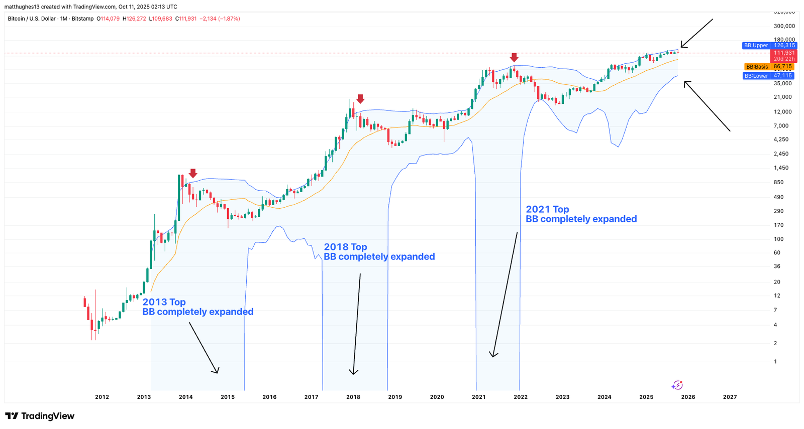 In previous bull cycles, including 2013, 2018, and 2021, Bitcoin peaked precisely when those monthly bands stretched far apart, signaling overheated volatility.