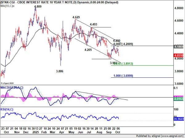 Technically, the yield continues to trade well below falling 55 D EMA (now at 4.186%) and comfortably within the descending channel that has guided the decline since May. Further fall should be seen to retest 3.992 low first, and break there will target 61.8% projection of 4.493 to 3.992 from 4.200 at 3.891 next.