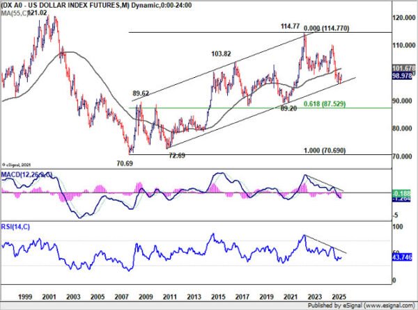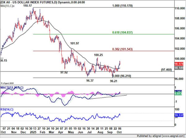 Dollar Index extended the rebound from 96.21 last week, climbing to 98.97. Technically, current rise is still viewed as correcting the five wave decline from 110.17 (2025 high). As long as support holds at 97.47, further upside is expected toward 100.25 resistance and possibly above.