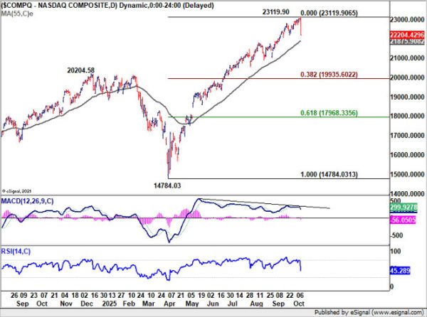 NASDAQ’s record-setting rally came to an abrupt pause on Friday as the index tumbled -3.56% from its all-time high of 23,119.90, hit earlier in the session. While the magnitude of the drop was striking, the broader structure remains bullish—no decisive break of key trend levels has occurred yet.