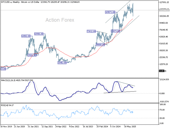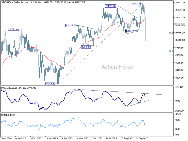 The late development also sparked violent moves in the cryptocurrencies markets. Bitcoin was no exception. Bitcoin extended the plunge from its recent record high of 126,289 to as low as 101,896, before stabilizing into the weekend.