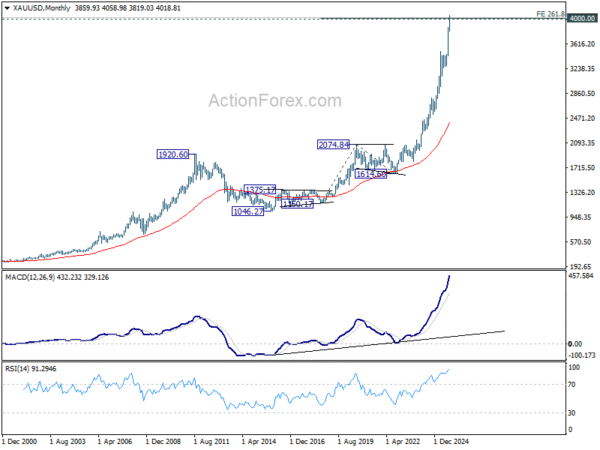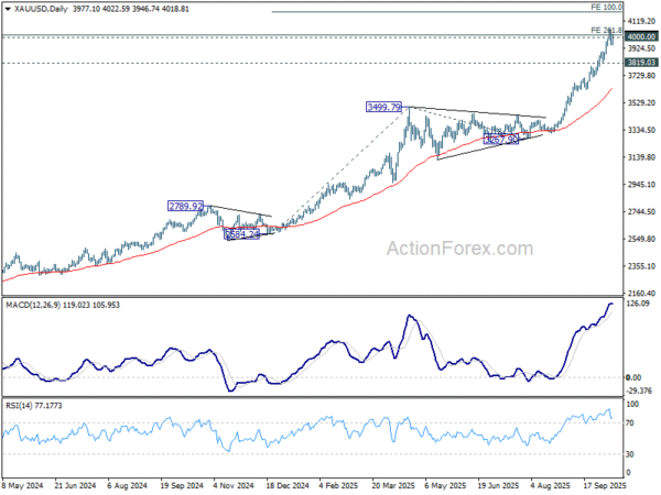 Technically, Gold has met a major target zone, reaching 261.8% projection of 1160.17 to 2074.84 from 1614.60 at 4009.20. The rally’s parabolic nature leaves it vulnerable to profit-taking, and the immediate focus now turns to 3819.03, where a break would confirm that a short-term top is in place. Deeper pullback could then follow toward 55 D EMA (now at 3625.49).