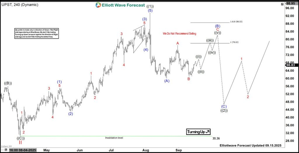 As expected in last article, UPST ended ((1)) impulse from April-2025 low at $93.67 high & correcting in ((2)) in 3 or 7 swings. We like to buy the next pullback in 3, 7 or 11 swings at extreme area, when reach.