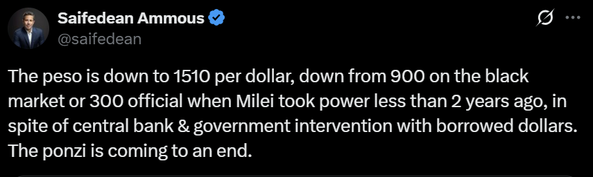 On Friday, Ammous doubled down, pointing to the peso’s collapse since Milei took office.