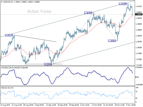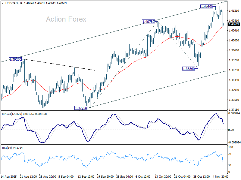 USD/CAD dips notably in early US session but stays above 55 4H EMA (now at 1.4055) so far. Intraday bias remains neutral first. On the upside break of 1.4139 will resume larger rally from 1.3538 to 100% projection of 1.3725 to 1.4078 from 1.3886 at 1.4239. However, sustained break of 55 4H EMA (now at 1.4052) will bring deeper fall back to 1.3886 support instead.