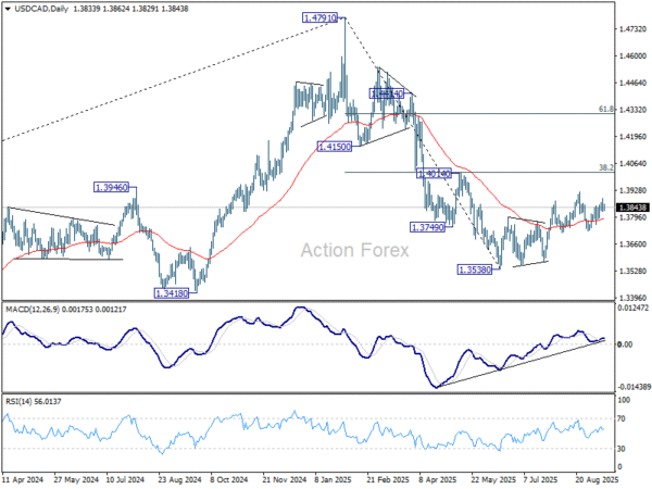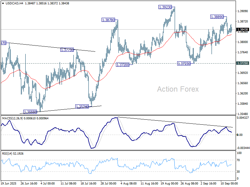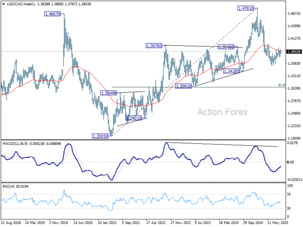 USD/CAD recovered to 1.3889 last week but lost momentum since then. Initial bias remains neutral this week first. On the downside, firm break of 1.3725 support will indicate that corrective rebound from 1.3538 has already completed, and turn near term outlook bearish. However, break of 1.3923 will resume the rebound towards 1.4014 cluster resistance.