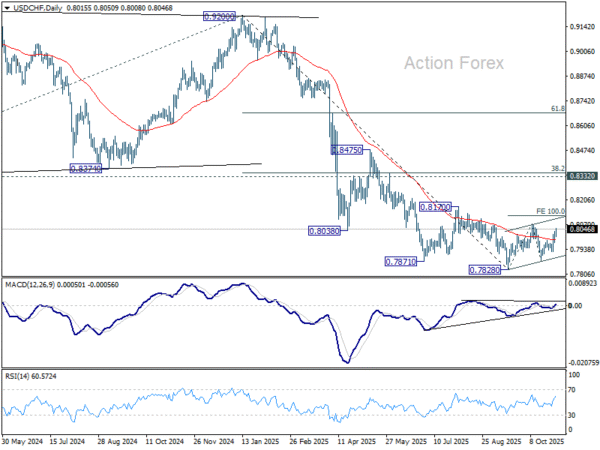 USD/CHF’s extended rebound last week suggests that corrective pattern from 0.7828 is not complete. Instead, it’s now extending with a third leg. Initial bias stays on the upside this week for 0.8075 resistance first. Break there will target 100% projection of 0.7828 to 0.8075 from 0.7872 at 0.8119. On the downside, below 0.8008 minor support will turn intraday bias neutral.