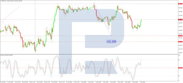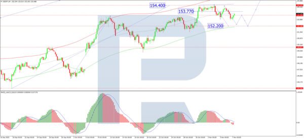 On the H4 chart, USD/JPY is forming a consolidation range around 153.33. We anticipate a near-term expansion of this range to the downside, targeting 152.20. Following this, the primary scenario involves an upward breakout, initiating a new bullish wave towards 155.70. An alternative downward breakout would signal a deeper correction towards 149.90 before any sustained recovery can begin. The MACD indicator supports this view, with its signal line below zero and pointing downward, confirming the current corrective momentum.