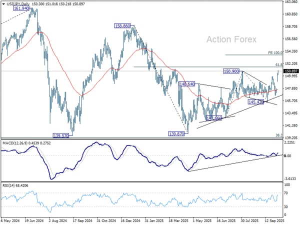 Breach of 150.90 suggests that USD/JPY’s rally from 139.87 is resuming. Intraday bias is stays on the upside for 151.22 fibonacci level. Sustained break there will carry larger bullish implication. Next near term target will be 100% projection of 142.66 to 150.90 from 145.47 at 153.71. On the downside, below 149.74 minor support will turn intraday bias neutral again first.