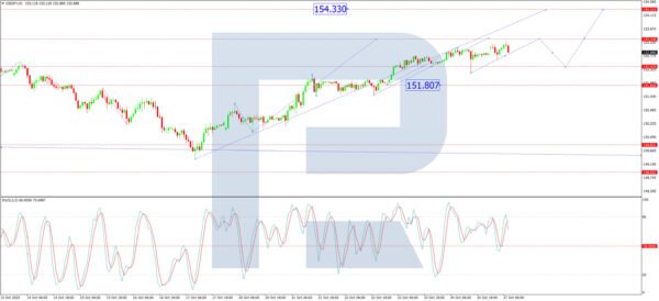 The H1 chart shows the completion of an initial growth wave to 153.25. The immediate focus is on a further push to 153.33. Upon reaching this local target, a corrective decline to at least 152.43 is likely. Once this correction is complete, the next leg of the uptrend is projected to drive the pair towards 154.33. This scenario is technically confirmed by the Stochastic oscillator, whose signal line is above 50 and trending strongly towards 80, indicating that near-term bullish momentum remains intact.