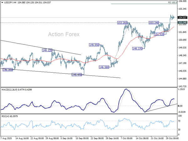 USD/JPY’s rally from 139.87 resumed by breaking through 153.26 resistance last week. Initial bias stays on the upside this week fir 100% projection of 146.58 to 153.26 from 149.37 at 156.05. Firm break there will target 158.86 resistance next. On the downside, below 153.24 resistance turned support will turn intraday bias neutral first. But outlook will stay bullish as long as 151.52 support holds, in case of retreat.