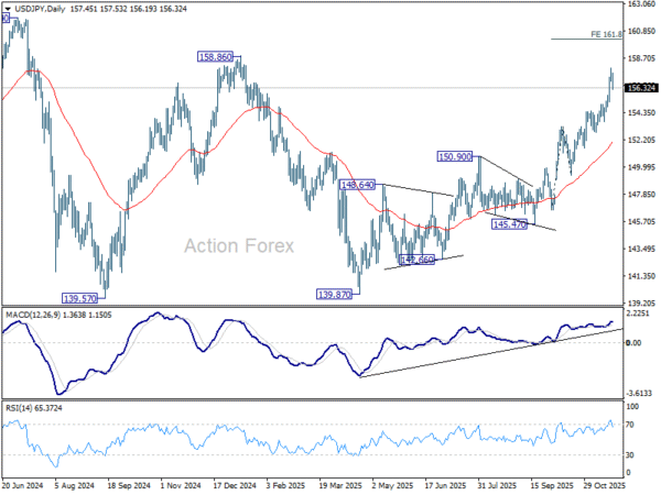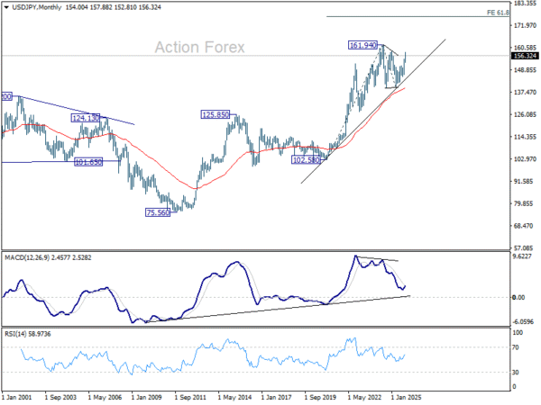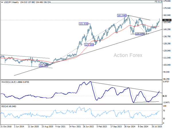 In the bigger picture, current development suggests that corrective pattern from 161.94 (2024 high) has completed with three waves at 139.87. Larger up trend from 102.58 (2021 low) could be ready to resume through 161.94 high. Decisive break of 158.85 structural resistance will solidify this bullish case and target 161.94 for confirmation. On the downside, break of 150.90 resistance turned support will dampen this bullish view and extend the corrective range pattern with another falling leg.