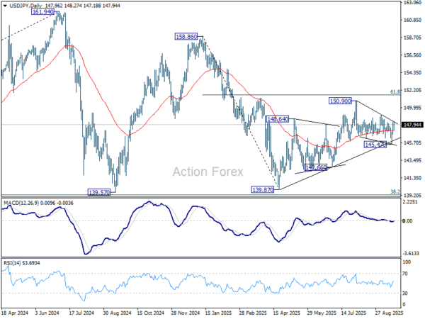 USD/JPY rebounded stronger after initial dip to 145.47 last week. The development argues that rise from 139.87 might still be in progress. But as upside is capped below 149.12 resistance, initial bias stays neutral this week first. On the upside, break of 149.12 will bring stronger rally to retest 150.90 high. However, break of 145.47 will resume the fall from 150.90 instead.