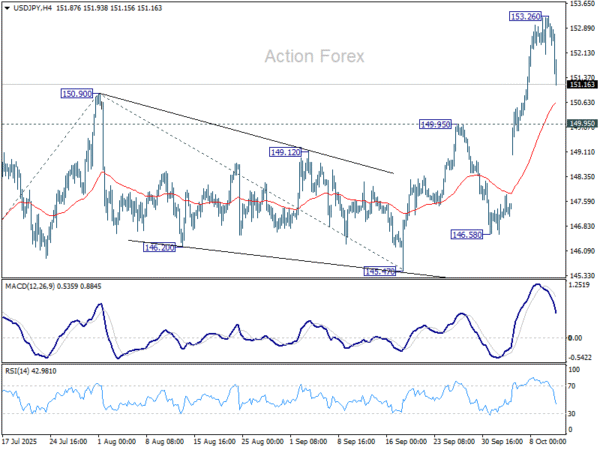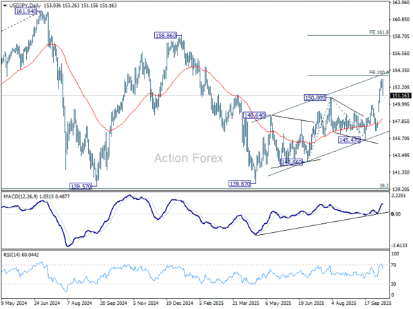 USD/JPY surged sharply to as high as 153.26 last week but retreated from there. Initial bias stays neutral for consolidations, and downside should be contained above 149.95 resistance turned support. Break of 153.26 will target 100% projection of 142.66 to 150.90 from 145.47 at 153.71. Firm break there will pave the way to 161.8% projection at 158.80. However, decisive break of 149.95 will bring deeper pullback to 55 D EMA (now at 148.22) instead.