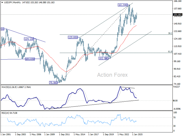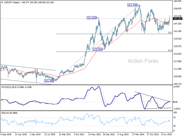 In the bigger picture, current development suggests that corrective pattern from 161.94 (2024 high) has completed with three waves at 139.87. Larger up trend from 102.58 (2021 low) could be ready to resume through 161.94 high. On the downside, break of 145.47 support will dampen this bullish view and extend the corrective pattern with another falling leg.