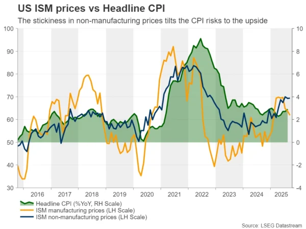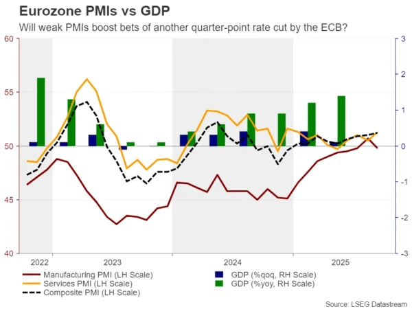 In the Eurozone, the preliminary S&P Global PMIs for October may set the tone for the euro, which took a hit lately following the gridlock in French politics. However, in terms of ECB monetary policy, the market is not fully factoring in any additional rate cuts. There is nearly a 70% chance of another 25bps reduction by July 2026, which means that some investors believe the ECB is done with easing policy.