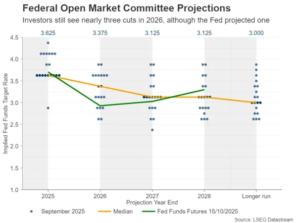 His comments allowed market participants to maintain expectations of two additional quarter-point rate cuts this year, while nearly fully factoring in another three in 2026. This stands in sharp contrast to the Fed’s latest dot plot, which indicated only a single cut next year, and underscores the potential for heightened volatility should forthcoming data tilt sentiment in either direction.